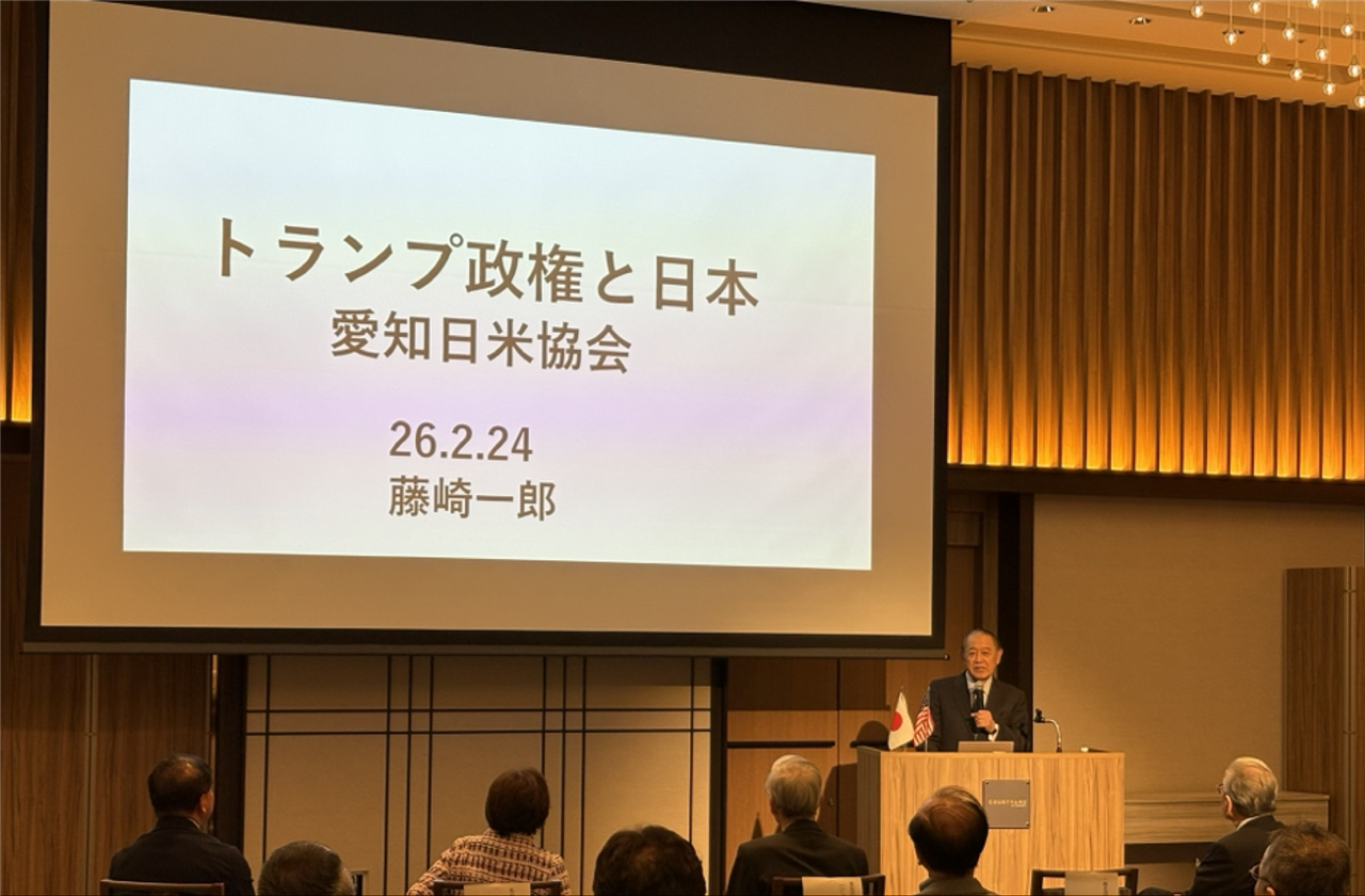 愛知日米協会では2026年2月24日にコートヤード・バイマリオット名古屋で交流懇親会を開催しました。 冒頭、主催者代表として内藤会長から挨拶をいただき、その後「トランプ政権と日本」と題して、一般社団法人日米協会の藤崎会長よりご講演いただきました。そして、当協会の安井名誉会長による乾杯のご発声を皮切りに立食・懇談を開始しました。参加者の皆さまには、和やかな雰囲気の中でご懇談をお楽しみいただけたご様子でした。